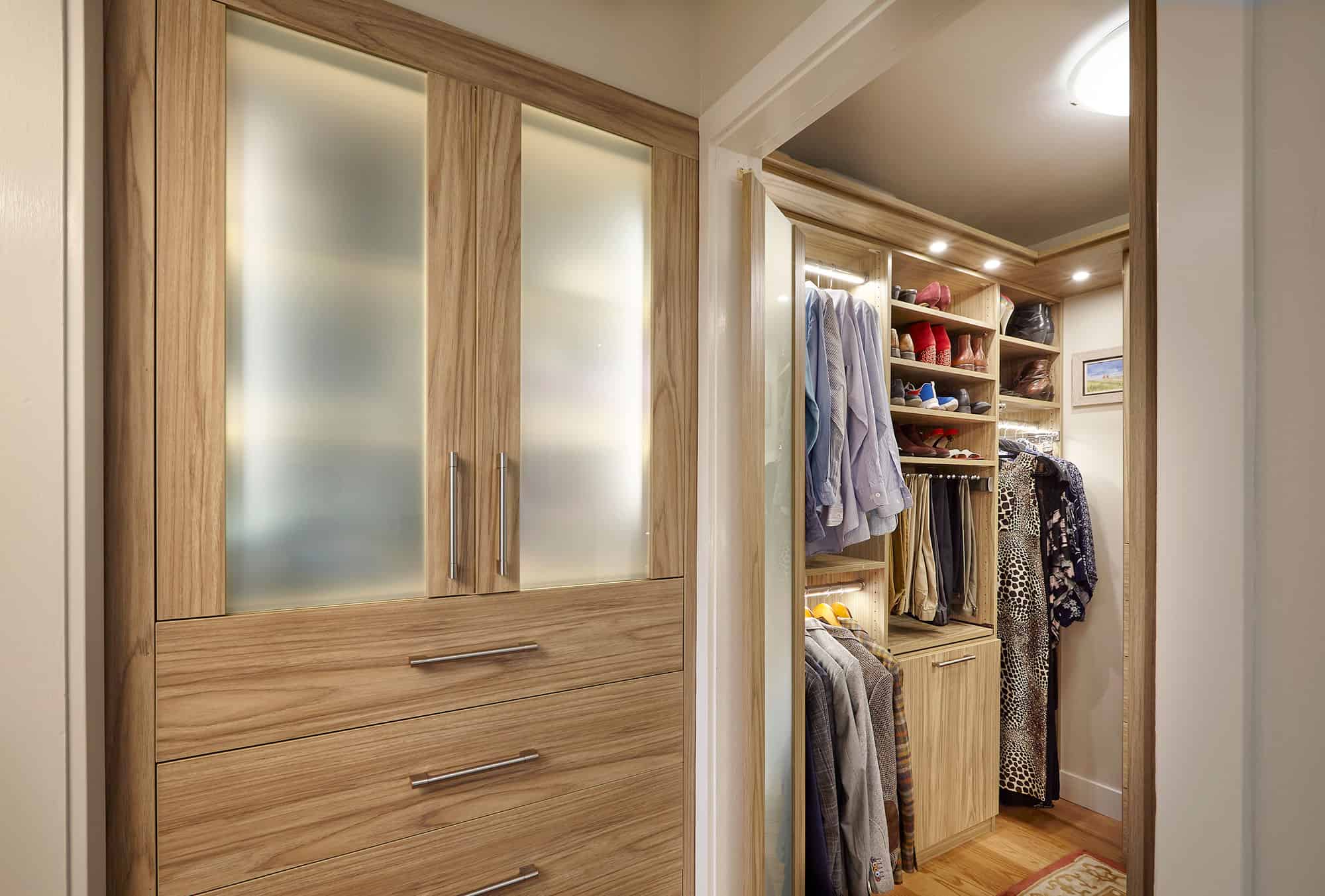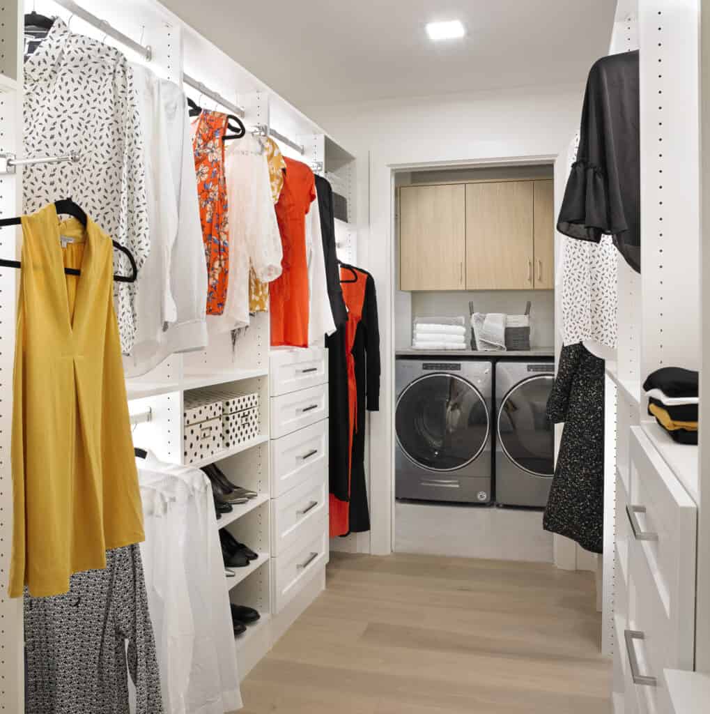 Our walk-in closets combine functionality with style and grace to create calming and low stress interaction with your daily clothing routines.